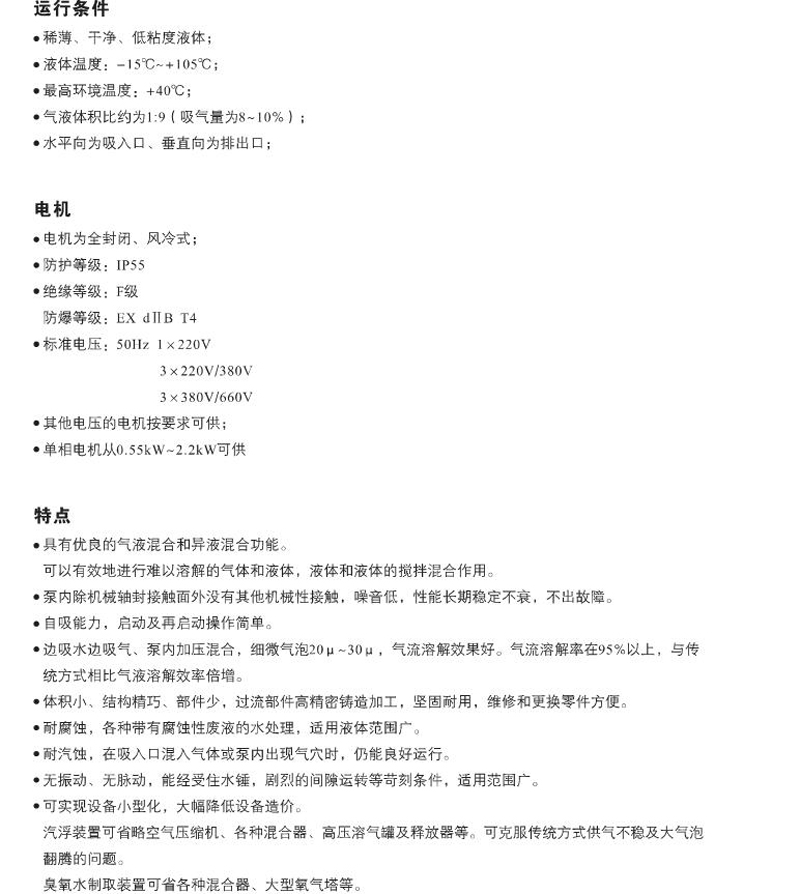 性能及優點:優良的氣液混合和異液混合功能; 邊吸水邊吸氣,細微氣泡20μ~30μ,氣液溶解效果好;自吸能力;噪音低;耐各種腐蝕,適用范圍廣。